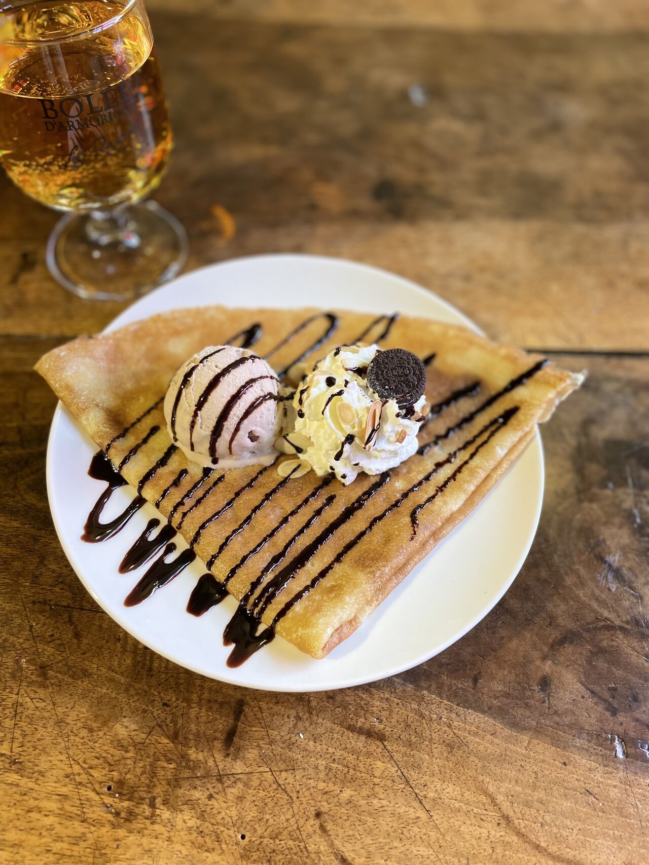 La terrasse est ouverte en continue entre les deux services pour un verre, une crêpe ou une glace.
